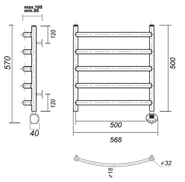 М/о расстояние (межосевое расстояние): 500Количество перекладин: 5Коллекция: КалипсоТип: электрическиеЦвет: золотоМощность, Вт: 300Ширина (мм): 532Высота (мм): 500Глубина (мм): 105-95Вес: 4,9Объем: 0,045375Тэн/подключение: справаСтрана: РоссияГарантия: 2 года