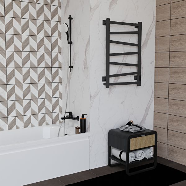 Полотенцесушитель чёрный матовый окрашен безопасной порошковой краской по специальной технологии для придания дополнительной стойкости к повреждениям и устойчивости к воздействию воды и пара. Плюс данной окраски также в том, что на покрытии не остаются отпечатки и разводы, а значит чистота и аккуратный вид сохранится дольше. Благодаря строгим формам электрополотенцесушитель прекрасно впишется в интерьер душевой комнаты или ванной. Особенностью данной модели являются перекладины, расположенные под наклоном.