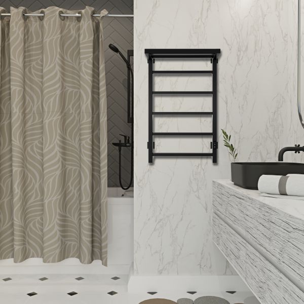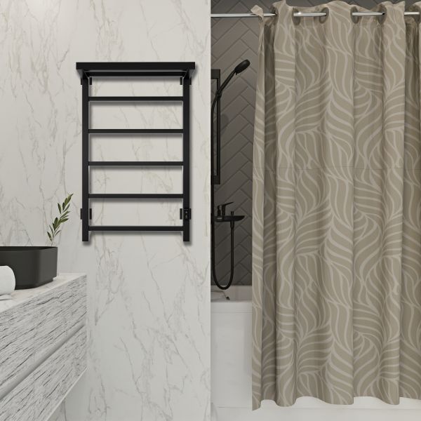 Компактный, красивый полотенцесушитель с терморегулятором в цвет. Полотенцесушитель дополнен полкой и в этом его преимущество, так как это дополнительное место для сушки полотенец, помогает организовать пространство в ванной комнате. Благодаря электрическому полотенцесушителю вы избавитесь от повышенной влажности в ванной, которая способствует появлению плесени. Модель имеет терморегулятор нагрева, у которого три режима: 40, 45, 50 градусов и таймер на отключение через 2, 4, 6 часов. Универсальность изделия предусматривает подключение через прямой провод или скрытое подключение без покупки дополнительного переходника. Длина прямого провода 1,1 метра. В комплектации идут 4 телескопических держателя, комплект монтажа и гарантийный паспорт на 3 года.