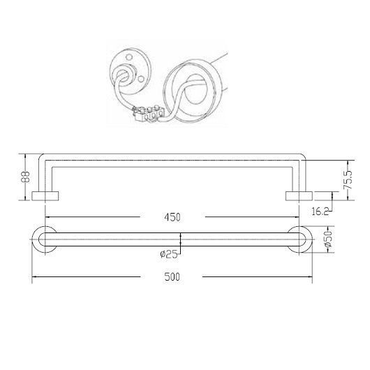 Материал - латунь, обогреваемая штанга для полотенец, латунная трубка 25 мм, нагреватель сухого типа, скрытое подключение, без выключателя, выступ: 88 мм, межосевое расстояние: 450 мм, монтаж: горизонтальный.