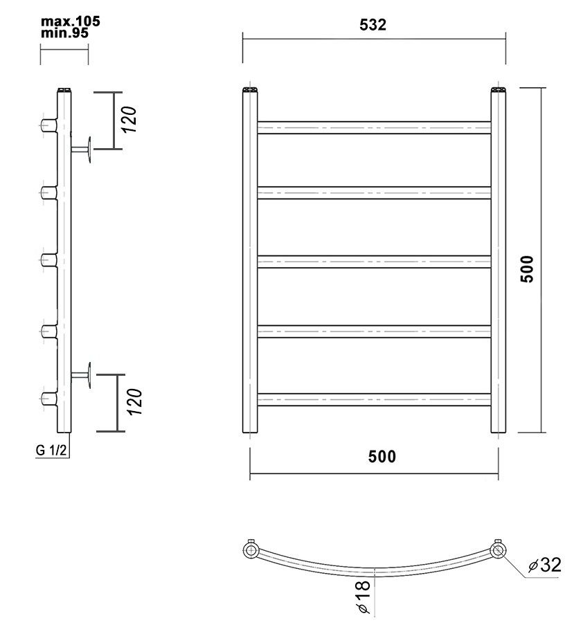 М/о расстояние (межосевое расстояние): 500Количество перекладин: 5Коллекция: КалипсоТип: водяныеЦвет: хромШирина (мм): 532Высота (мм): 500Глубина (мм): 105/95Вес: 3,79Объем: 0,045Тэн/подключение: нижнееСтрана: РоссияГарантия: 10 лет