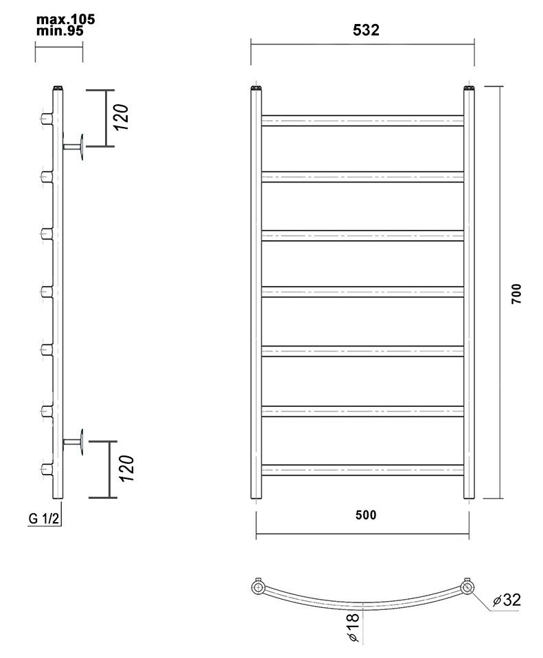 М/о расстояние (межосевое расстояние): 500Количество перекладин: 7Коллекция: КалипсоТип: водяныеЦвет: хромШирина (мм): 532Высота (мм): 700Глубина (мм): 105-95Вес: 4,07Объем: 0,062Тэн/подключение: нижнееСтрана: РоссияГарантия: 10 лет