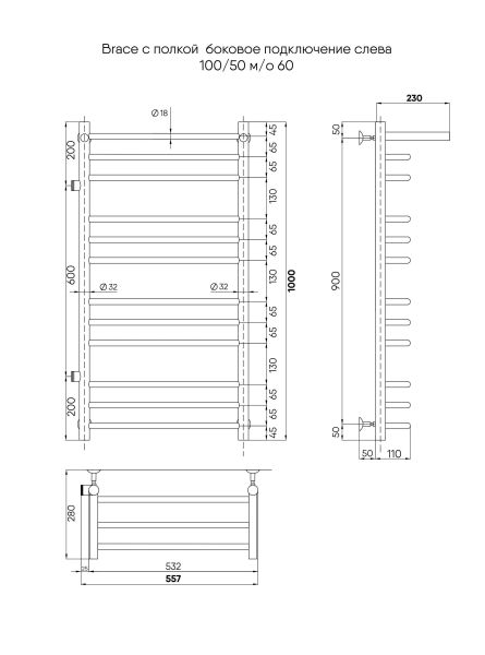 Полотенцесушитель водяной INDIGO Brace с полкой со скобообразными перекладинами и боковым подключением, выполнен в цвете «Черный Муар». Полотенцесушитель с полками одна из самых популярных моделей, так как она позволяет дополнительно разместить на изделии полотенца и халаты.