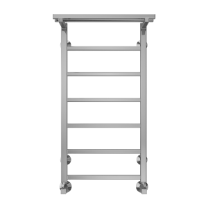 Модель "Контур с полкой" относится к линейке в стиле хай-тек, тяготеющей к лаконичным формам и хромированным поверхностям, и отличается наличием дополнительной прогреваемой полки для хранения и сушки полотенец.
