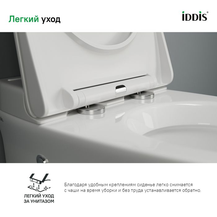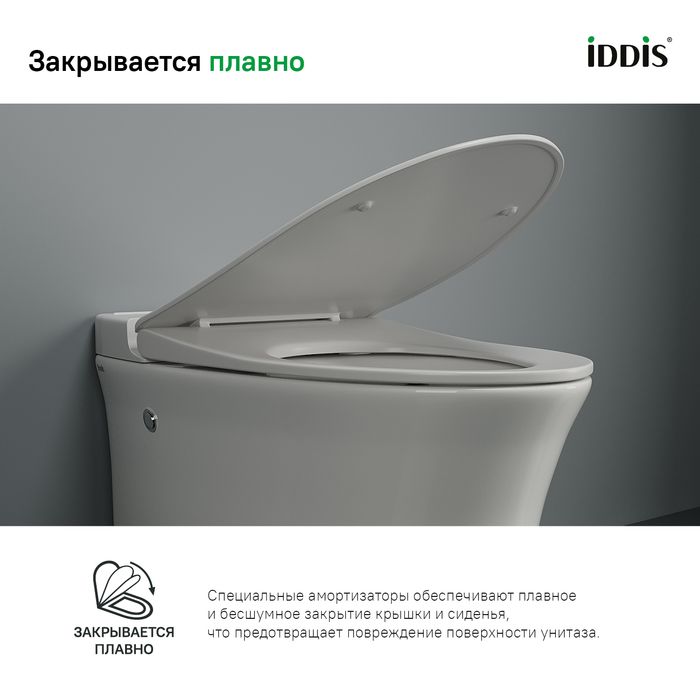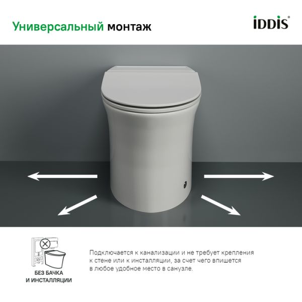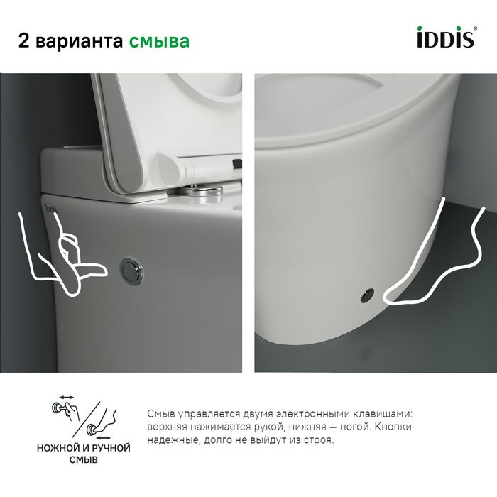 Управляется электронными клавишами: верхняя нажимается рукой и включает полный смыв 8 л, нижняя для частичного смыва 4 л – ногой. Кнопки надежные – защищены силиконовой втулкой.• Смывной блок работает от четырех батареек А4 (покупаются отдельно). Когда заряд батареек начнет снижаться, область вокруг кнопок будет подсвечиваться красным.• Сиденье из прочного дюропласта устойчиво к царапинам и надолго сохранит белый цвет/Возможности для монтажа:• Подключается к канализации и холодной воде напрямую и не требует крепления к стене или к инсталляции, за счет чего можно установить в любом удобном месте в санузле. • Простой монтаж – понадобится не более 5 минут.Продуманное решение:• Технологичная и доступная альтернатива унитазам-компактам старого дизайна и сложным работам по установке инсталляции.Гарантия на санитарную керамику IDDIS® – 25 лет, на блок электроники – 2 года, на сиденье – 3 года.