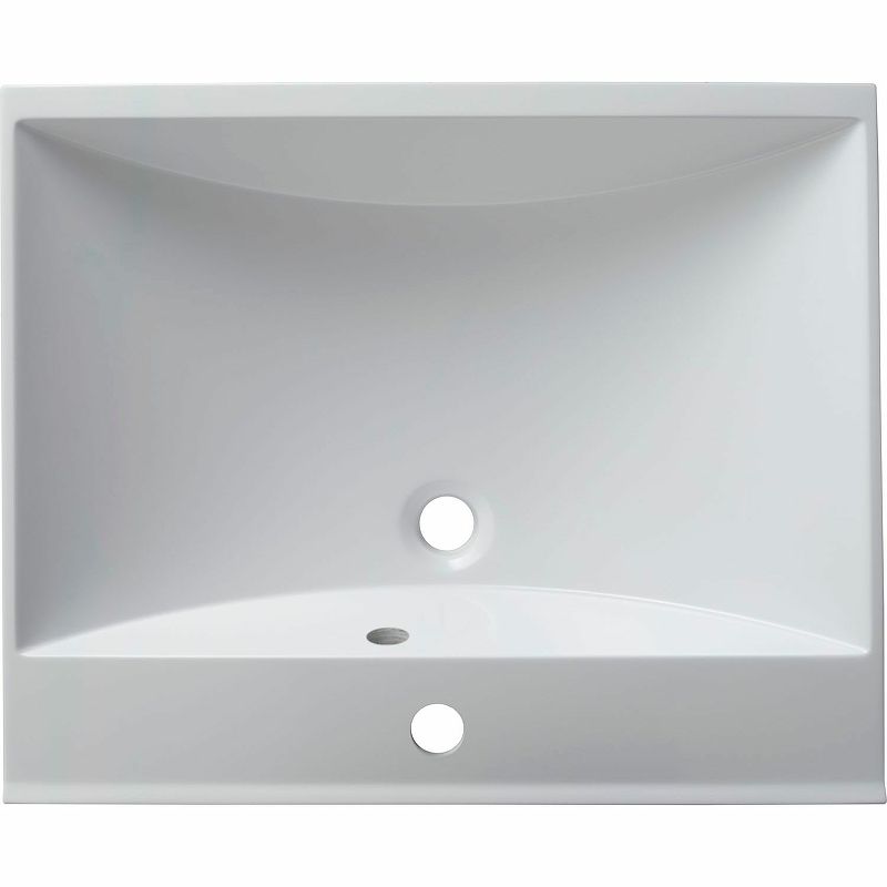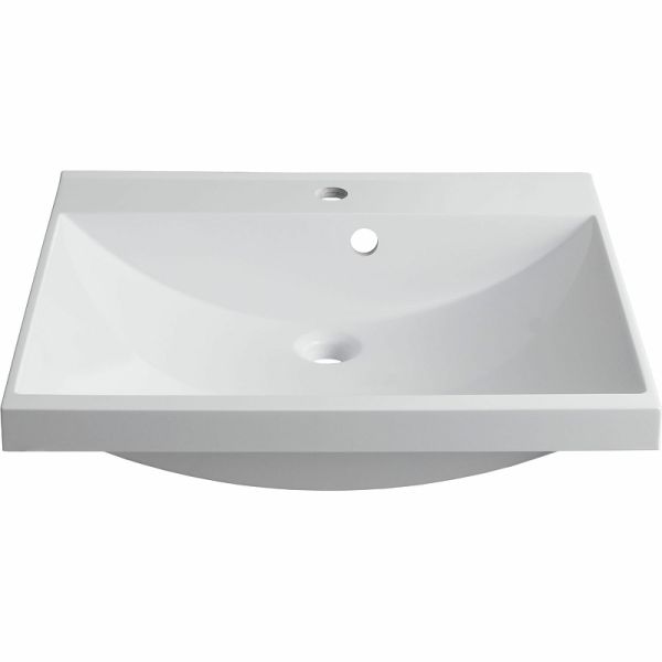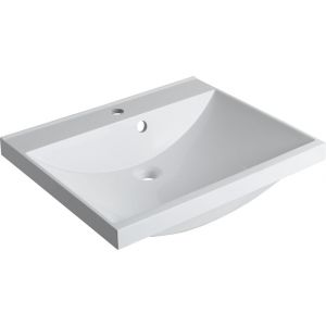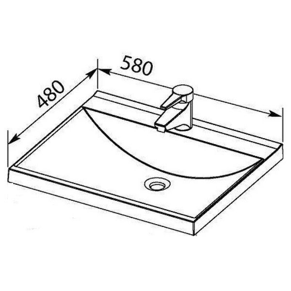 Полувстраиваемую модель универсальной ориентации размером 58х48 см размещают на подвесной или напольной тумбе. Раковина в стиле модерн органично впишется в интерьер ванной комнаты квартиры, дома или отеля. На бортике располагается отверстие под смеситель. Чашу высотой 14 см легко наполнить водой для стирки мелких вещей, а благодаря изогнутому дну — опустошить в считанные минуты через слив, встроенный точно по центру.