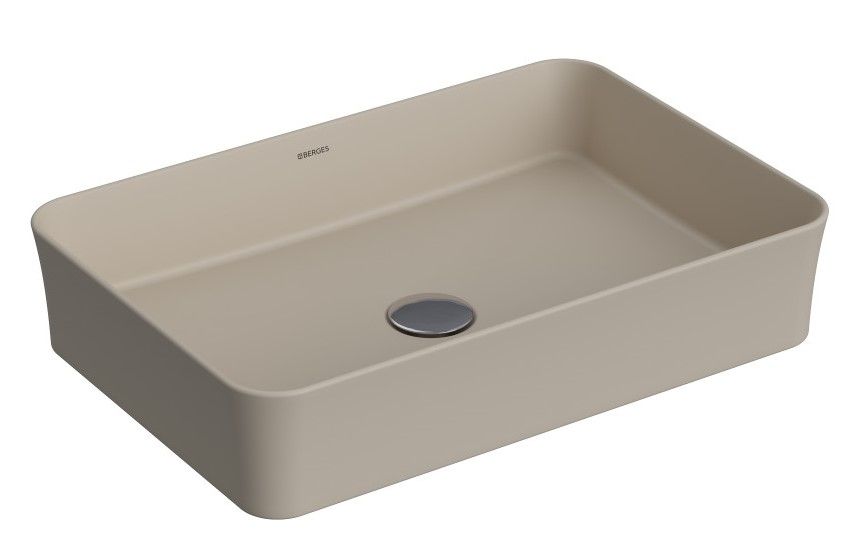 Накладная раковина из санфарфора Berges Ego SL размером 55х38х11,5 см.Прямоугольной формы, без отверстия под смеситель, цвет матовый жасмин.Тонкостенная.Гарантия 10 лет*Донный клапан необходимо приобрести отдельно