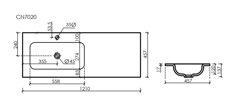- Коллекция Grace. Размер 1210x457x137 мм, с отверстием под смеситель.