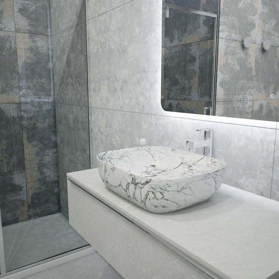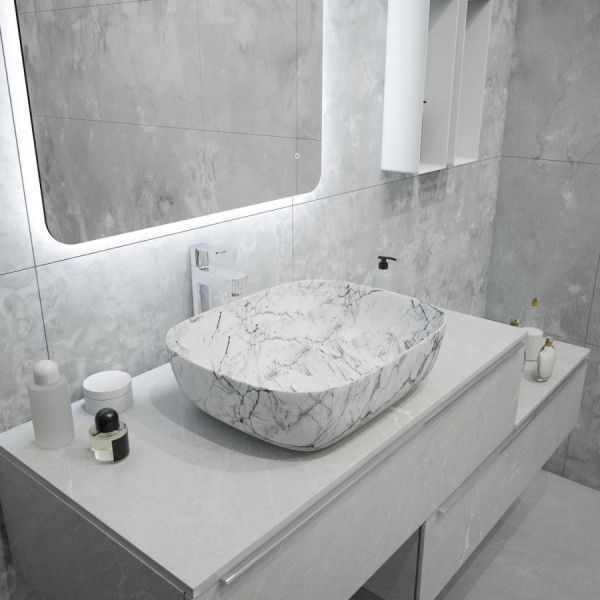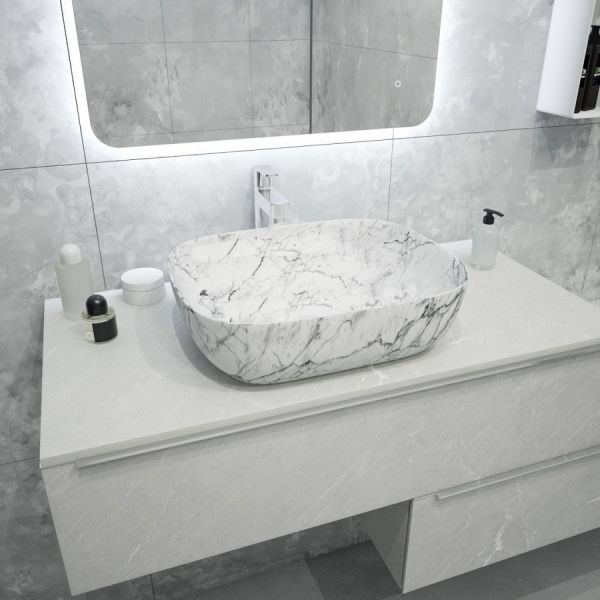 Раковина чаша Maretti FL13NS25-740MR, белый мрамор. Материал: санфарфор. Размер: 49x39,5x15. Форма: прямоугольная. Преимущества: - гарантия на изделие – 10 лет; - произведён из санфарфора высшего качества; - антибактериальное водоотталкивающее покрытие чаши; - материал не выцветает со временем и не теряет потребительских свойств; - санфарфор надёжен, устойчив к появлению сколов и царапин.