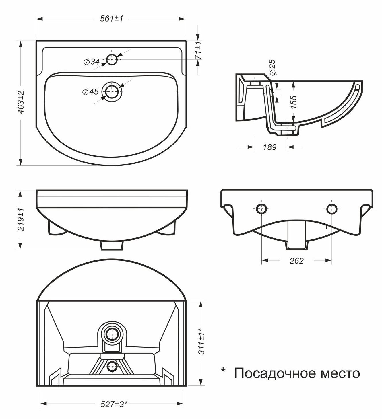 Размеры умывальника: 561 х 463 х 219