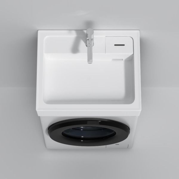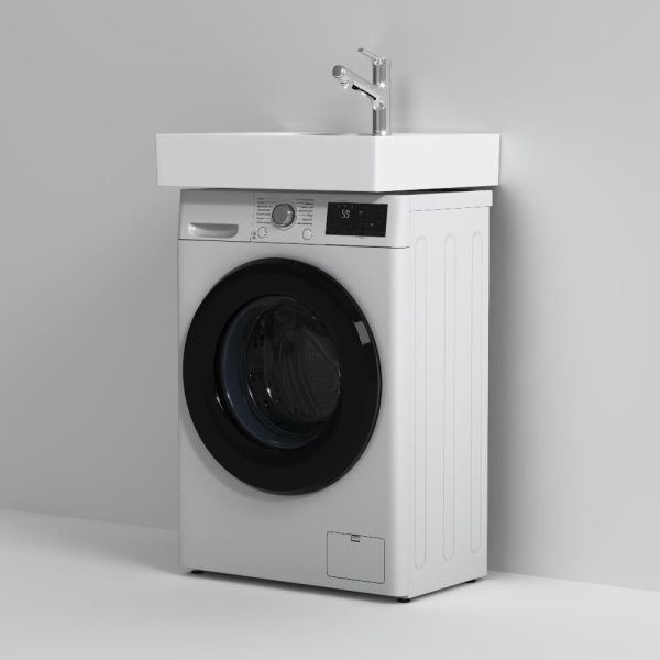 Размещение раковины над стиральной машиной позволяет максимально эффективно использовать ограниченное пространство, особенно в маленьких ванных комнатах.