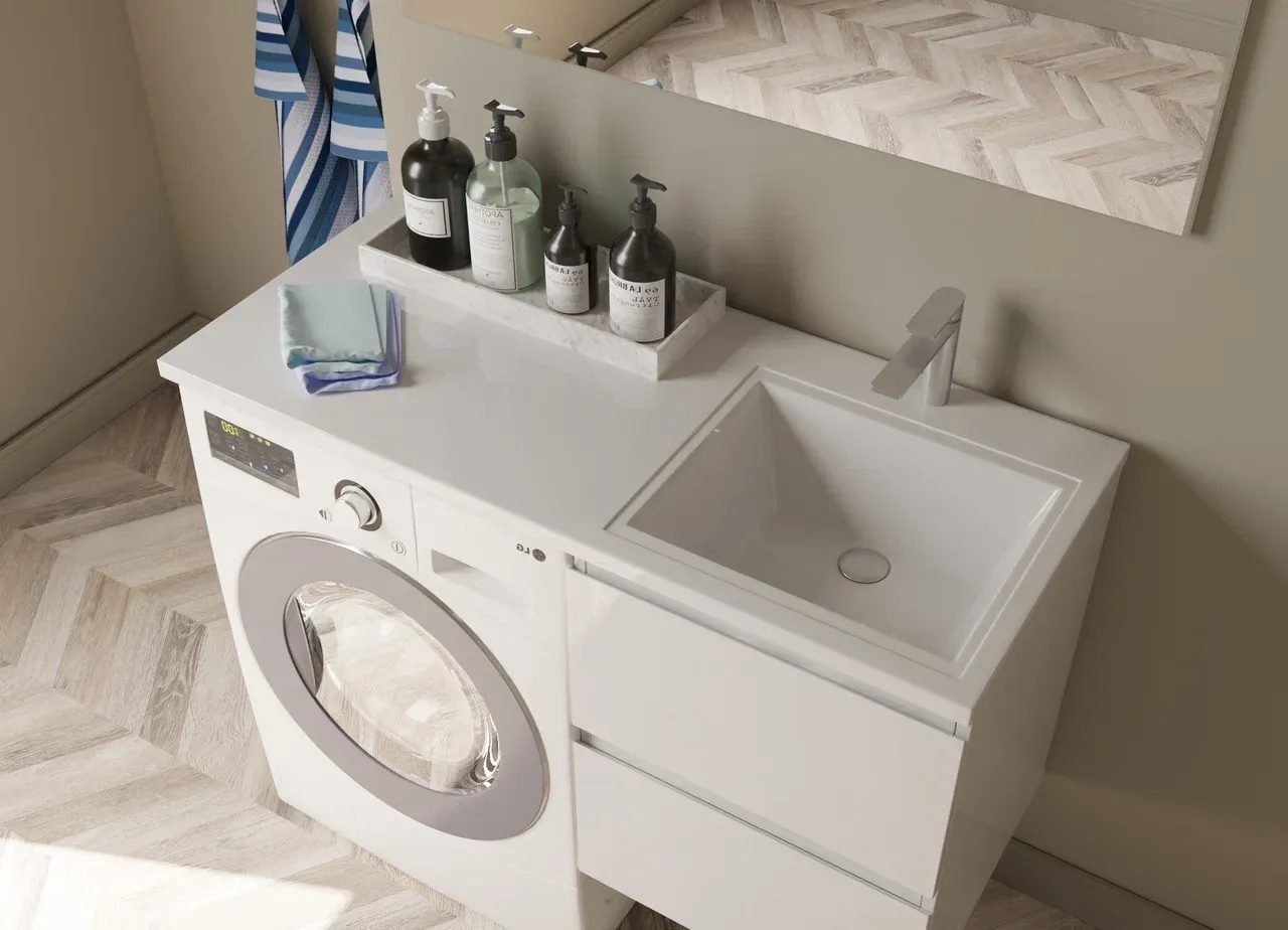 Изящнаая раковина гармонично впишется в любой интерьер ванной комнаты и позволит рационально использовать пространство над стиральной машиной.