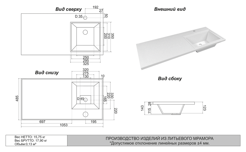 Тип: раковиныПо форме: прямоугольныеРазмер, мм (ШxГxВ): 1050x485x143Размер в упаковке, мм (ШxГxВ): 1080x515x173Цвет: белыйВес с упаковкой, кг: 17.9По монтажу: мебельнаяМатериал: литьевой мраморОсобенности: установка над стиральной машиной, со столешницей