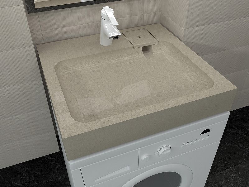 Раковина в ванную комнату для установки над стиральной машинкой бежевого цвета. Крепится на кронштейны, которые входят в комплект поставки. Верхний слой высококачественного гелькоута образует декоративно-защитное покрытие.