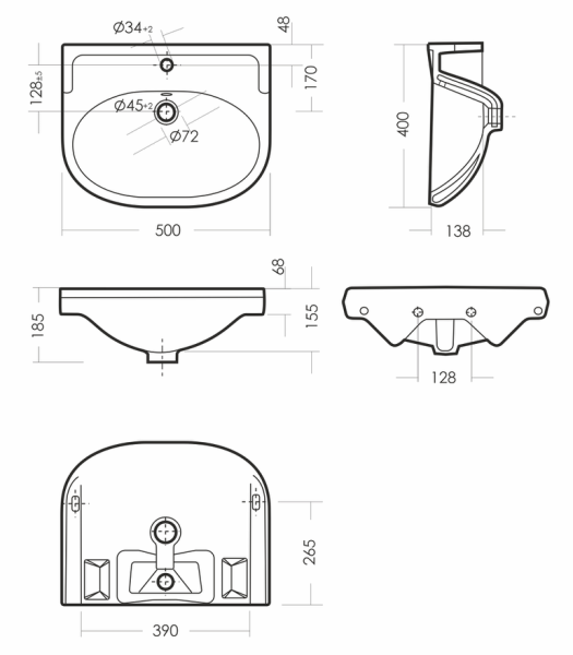 Умывальник КОМФОРТ представлен в базовом размере 50 сантиметров и с возможностью монтажа к стене или на кронштейны.