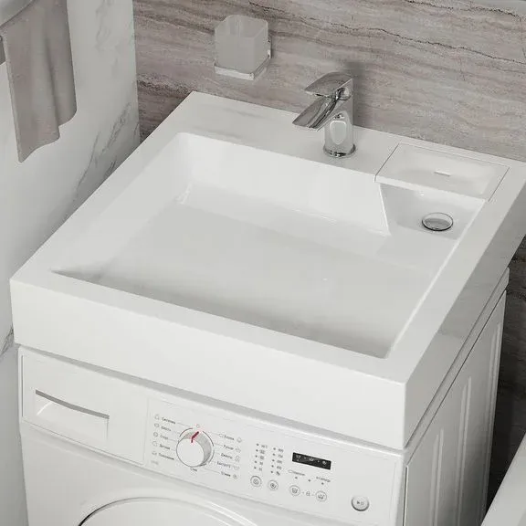 Раковина Reflexion Sigma спроектирована специально для установки над стиральной машинкой. Она имеет неглубокую чашу и горизонтальный слив. Благодаря ему умывальник из искусственного мрамора для ванной комнаты отводит воду в сифон, который проходит позади стиральной машины. Это защищает технику от случайных утечек.