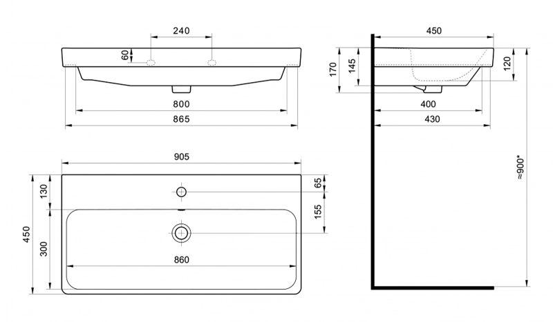 Тип: раковиныПо форме: прямоугольныеРазмер, мм (ШxГxВ): 900x450x170Размер в упаковке, мм (ШxГxВ): 930x480x200Цвет: белыйВес с упаковкой, кг: 24.55По монтажу: мебельнаяМатериал: керамика