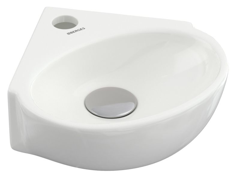 Подвесная раковина из санфарфора Berges Small размером 31,5х30х9,5 см.Угловая, с отверстием под смеситель, глянцевая белая.Крепеж в комплекте. Подходит для использования на столешнице.