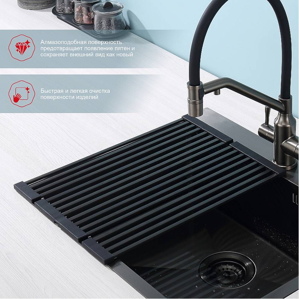 Ролл-мат из нержавеющей стали используются для мытья и просушивания посуды и продуктов. Устанавливаются на бортики мойки, можно использовать на крыле мойки или на кухонной столешнице в качестве подставки под горячую посуду. Гибкие силиконовые крепления по краям ролл-мата позволяют компактно свернуть его для хранения.