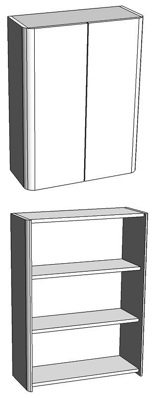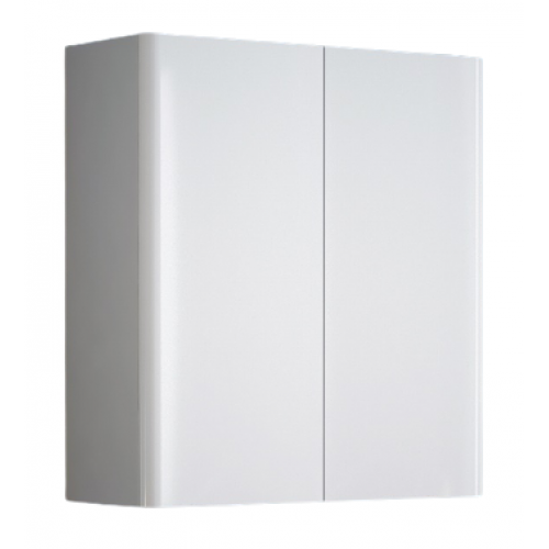 Подвесной шкаф имеет интересный эргономичный дизайн - скругление боковин плавно переходит в скругления на фасадах. У шкафа 2 распашные двери, позади - 2 вкладные полки. Все двери имеют петли с доводчиками. Ручек нет, конструктив шкафа позволяет открывать двери без использования ручек. Присутствуют подвесы для крепления на стене.