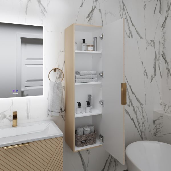 Корпус и фасады выполнены из влагостойкого МДФ, покрытого матовой краской. Это делает пенал прочным, устойчивым к влаге и безопасным для использования в условиях ванной комнаты.Размеры: