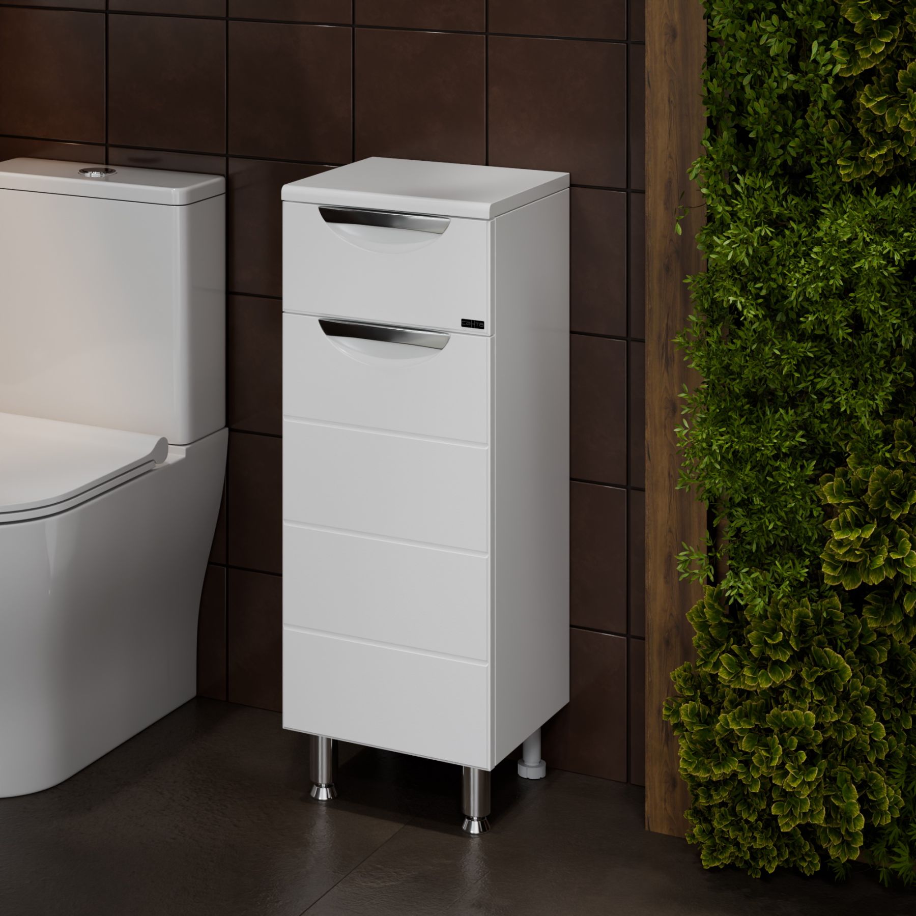 Компактные габариты позволяют грамотно организовать небольшой санузел, а пространство за распашными дверцами с механизмом плавного закрывания поможет разместить все необходимые вещи.