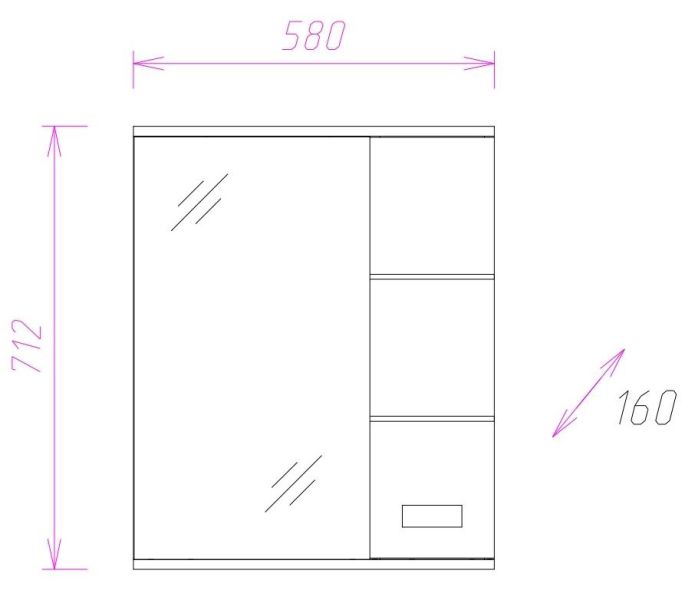 Справа от зеркала за распашной дверцей с механизмом плавного закрывания расположено отделение для хранения, разделенное на две части горизонтальной полочкой, под зеркалом - открытая полочка для косметических средств или декоративных элементов.