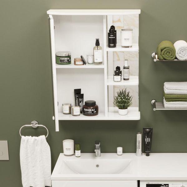 Открытые полочки справа обеспечивают быстрый доступ к часто используемым аксессуарам, а пространство за распашной зеркальной дверцей с механизмом плавного закрывания, разделенное полочкой, станет удобным местом для хранения различных бытовых принадлежностей.