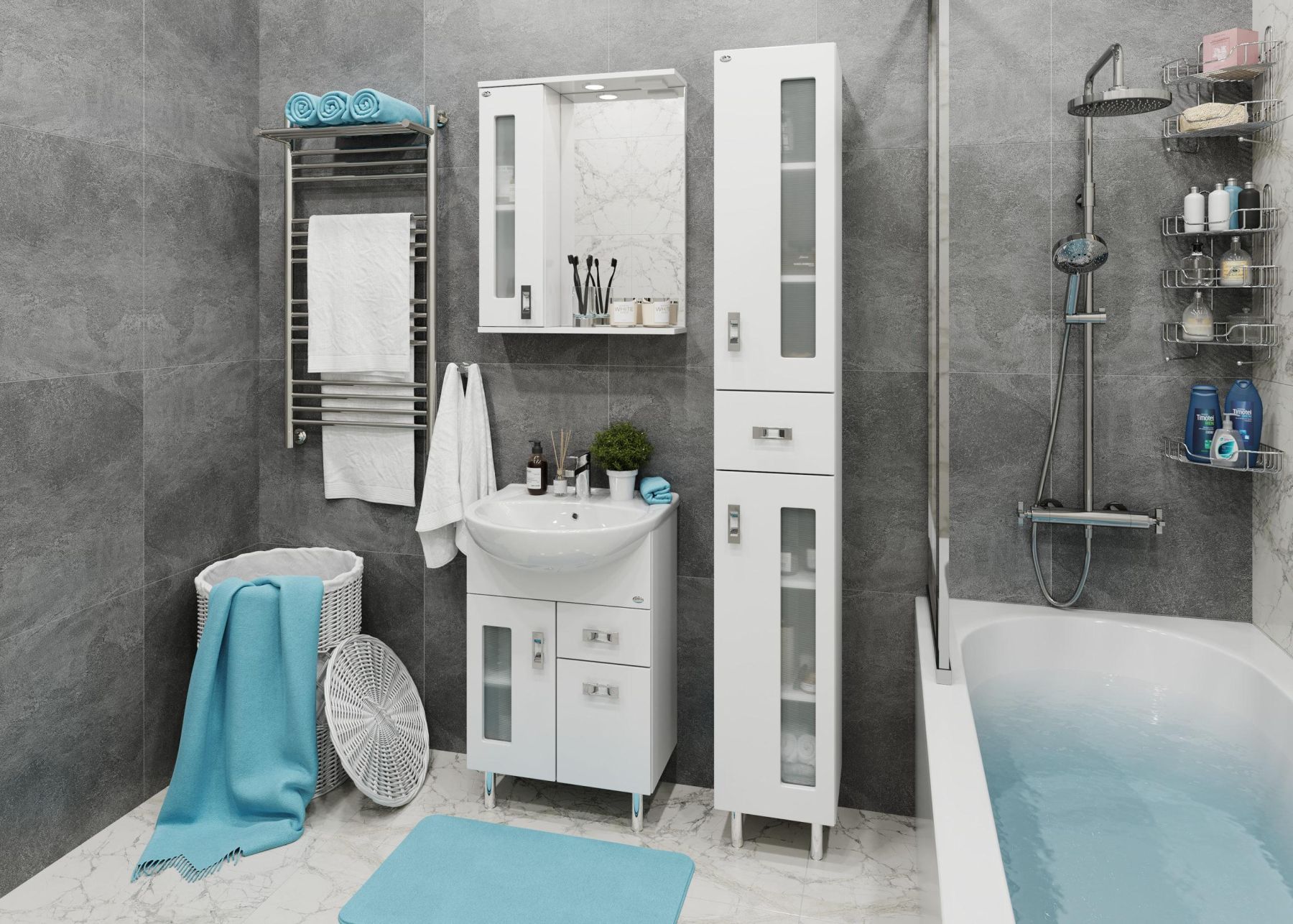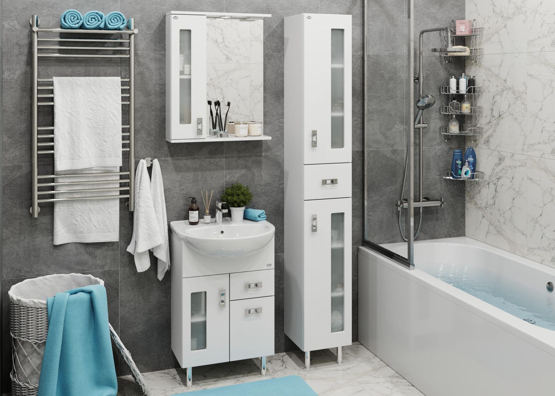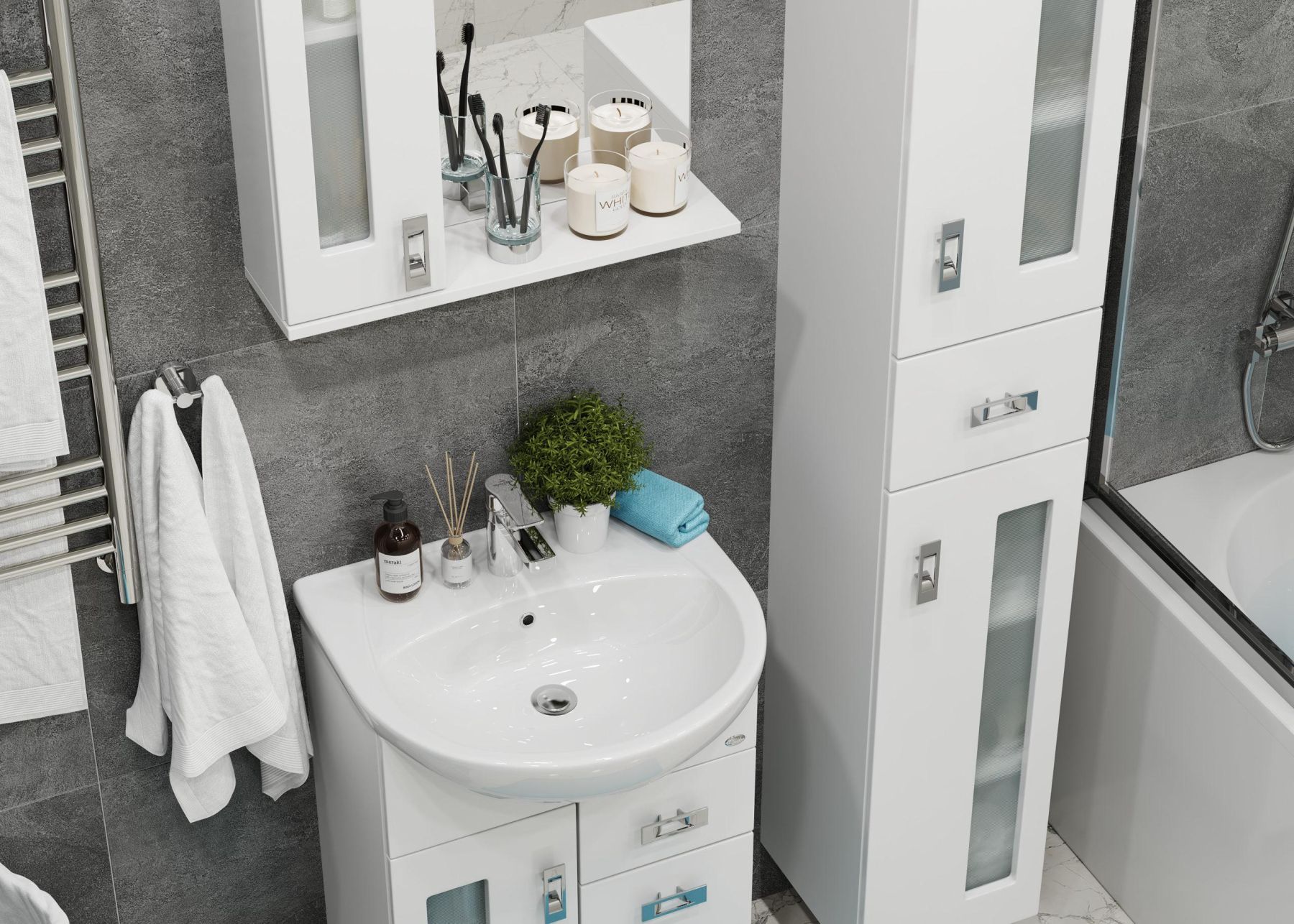 Белоснежный цвет фасада в сочетании со вставками из матового стекла и хромированными ручками необычной формы придадут ванной комнате ощущение свежести, чистоты и уюта.