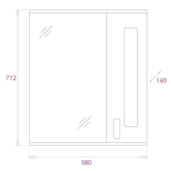 Справа от зеркала за распашной дверцей с механизмом плавного закрывания расположено отделение для хранения, разделенное полкой, под зеркалом - открытая полочка для косметических средств или декоративных элементов.