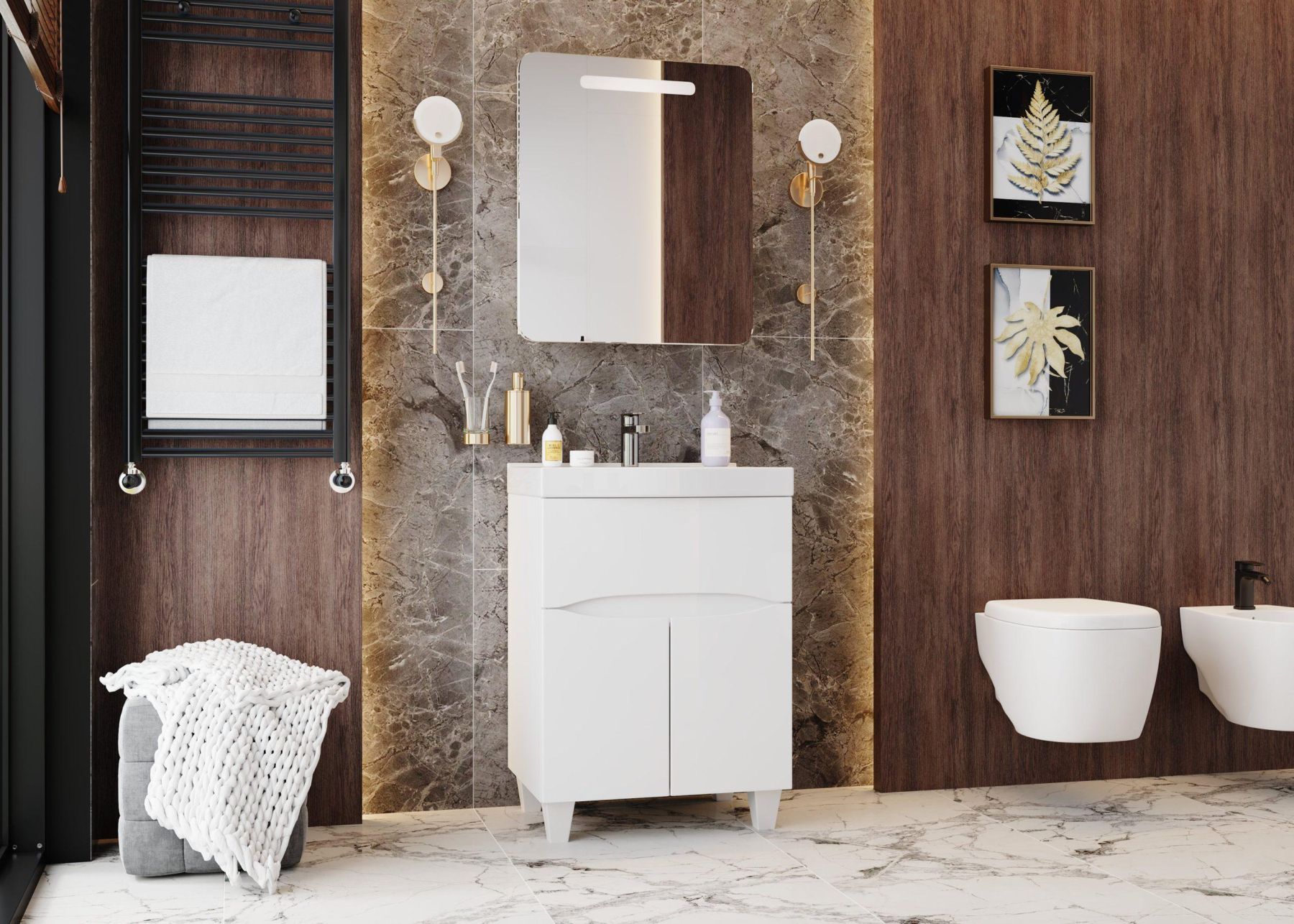 Дверца с механизмом плавного закрывания - она же зеркальный фасад со скошенными углами и светодиодной подсветкой, скрывает вместительное пространство для хранения, разделенное стеклянной полочкой с еврокромкой.