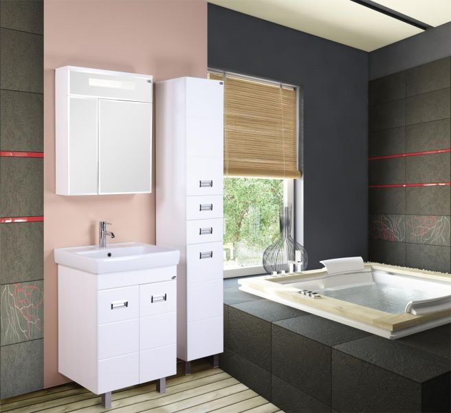 Внешне это отражается в лаконичной прямоугольной форме без ручек и лишнего декора и стильной подсветке, в функционально - в двух дверцах разного размера с механизмом плавного закрывания, скрывающих просторное пространство для хранения необходимых вещей, разделенное на 2 части стеклянной полочкой с еврокромкой.