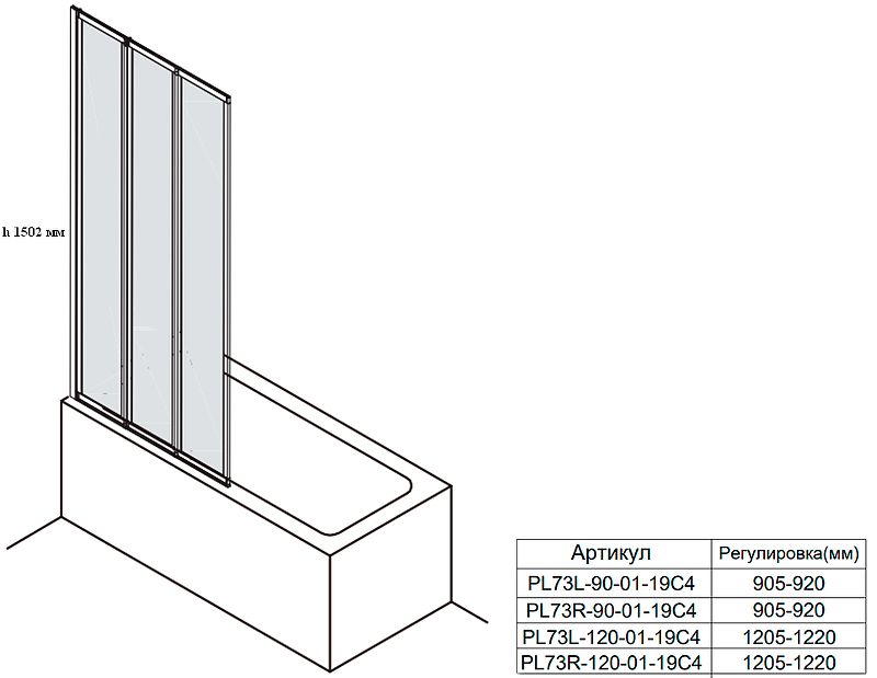 Шторка на ванну Veconi Palau PL-73L, 1200x1500, хром, стекло прозрачное