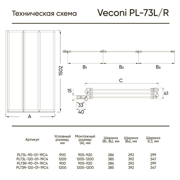 Шторка на ванну Veconi Palau PL-73R, 1200x1500, хром, стекло прозрачное