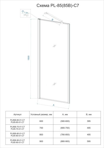 Шторка на ванну Veconi Palau PL-85, 700x1500, хром, стекло прозрачное
