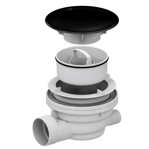 Сифон Velplex QYD-01 со съемным гидрозатвором для душевых поддонов. Верхняя крышка сифона черного цвета.