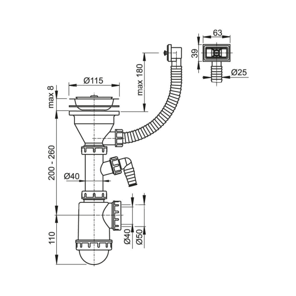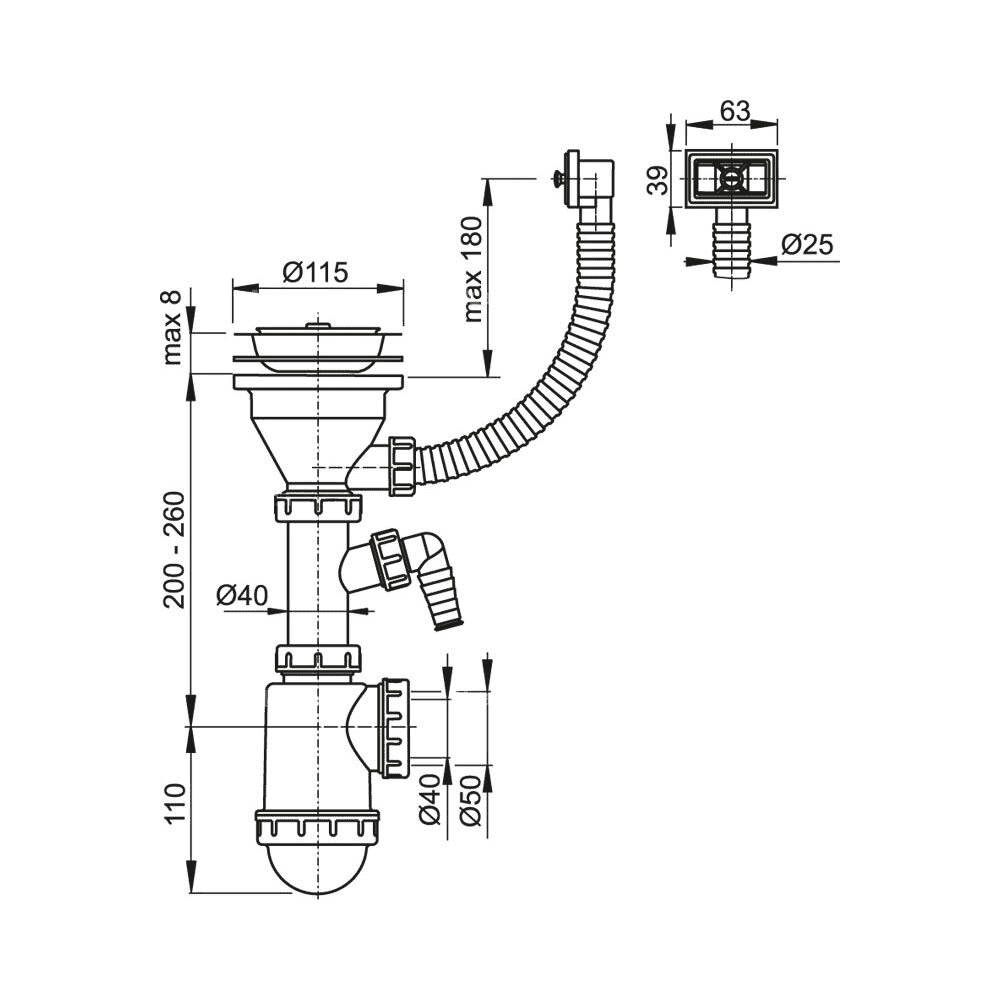 Сифон для мойки AlcaPlast с нержавеющей решеткой ?115 гофропереливом и подводкой A447P-DN50/40