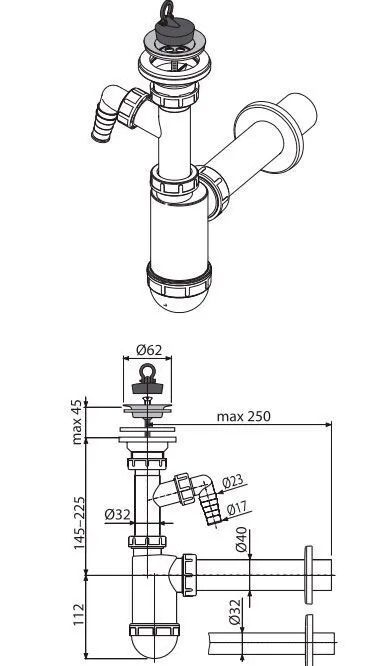 Сифон для раковины AlcaPlast ?32 с нержавеющей решеткой ?63 и подводкой A410P