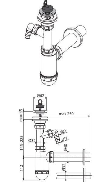 Сифон для раковины AlcaPlast ?32 с нержавеющей решеткой ?63 и подводкой A410P купить