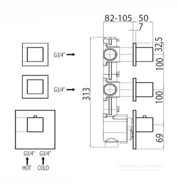 Скрытая часть термостата Bossini Z030203000 на три потребителя