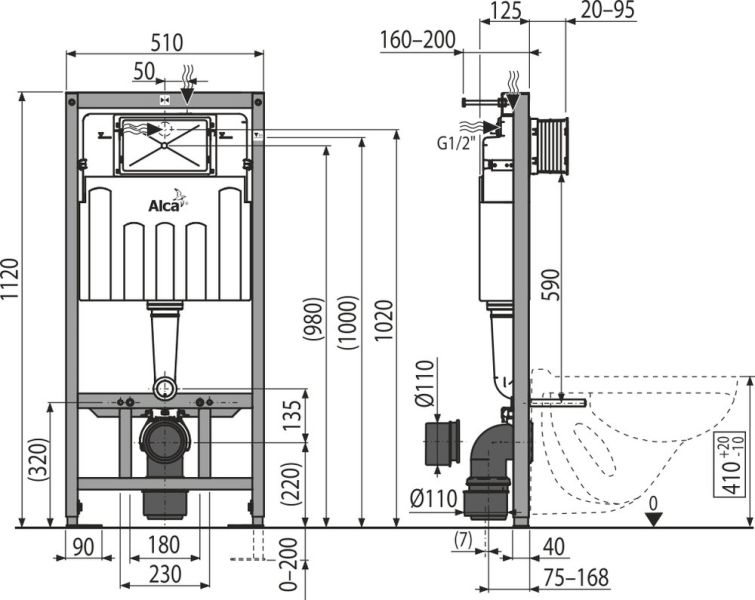 Для установки подвесного унитаза с расстоянием между точками крепления 180 или 230 мм подойдет система инсталляции AlcaPlast Sadromodul AM101/1120-001. Изделие выполнено в виде рамного модуля для монтажа к гипсокартонной конструкции. Выполненная из металла несущая конструкция обработана порошковой краской, которая обеспечивает длительный срок службы. При помощи выдвижных ножек можно отрегулировать высоту унитаза в диапазоне 0–200 мм. Установленная система закрывается гипсокартонным листом и не нуждается в дополнительных крепежных элементах.Конструкция рамы позволяет установку к самостоятельной гипсокартонной перегородке или перед несущей стеной