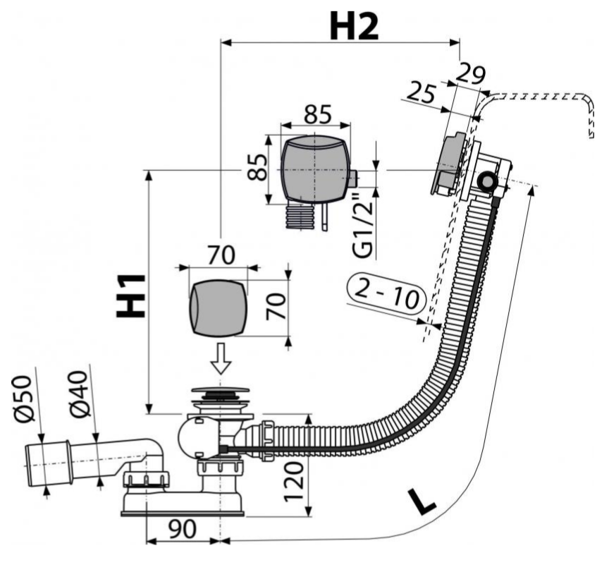 - Для ванн с выпускным отверстием Ø52 мм