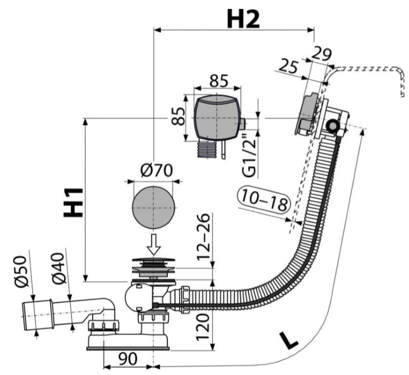 - Для ванн с выпускным отверстием Ø52 мм