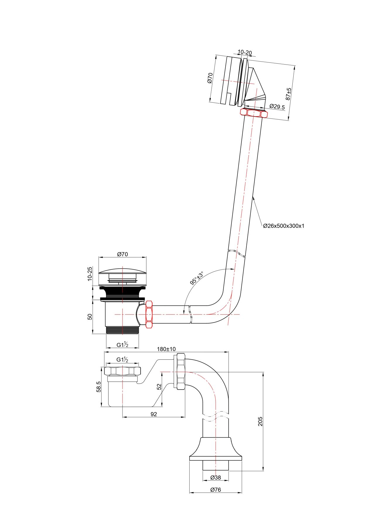 Washbasin 3000.01 CR Слив-перелив Click-Clack 95* для отдельностоящих ванн (Атрия, Ретро, Капри, Мальборо, Монако, Лотус, Прима), хром