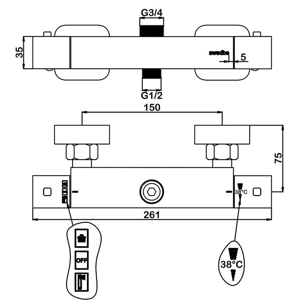 Термостатический смеситель для душа с верхним подключениемКерамическая кран букса.Термостатический картридж с шумоподавлением.Обратные клапаны. Ограничитель температуры 38°.Эксцентрики и декоративные накладки.Гигиенически стабильная латунь с высоким содержанием меди.