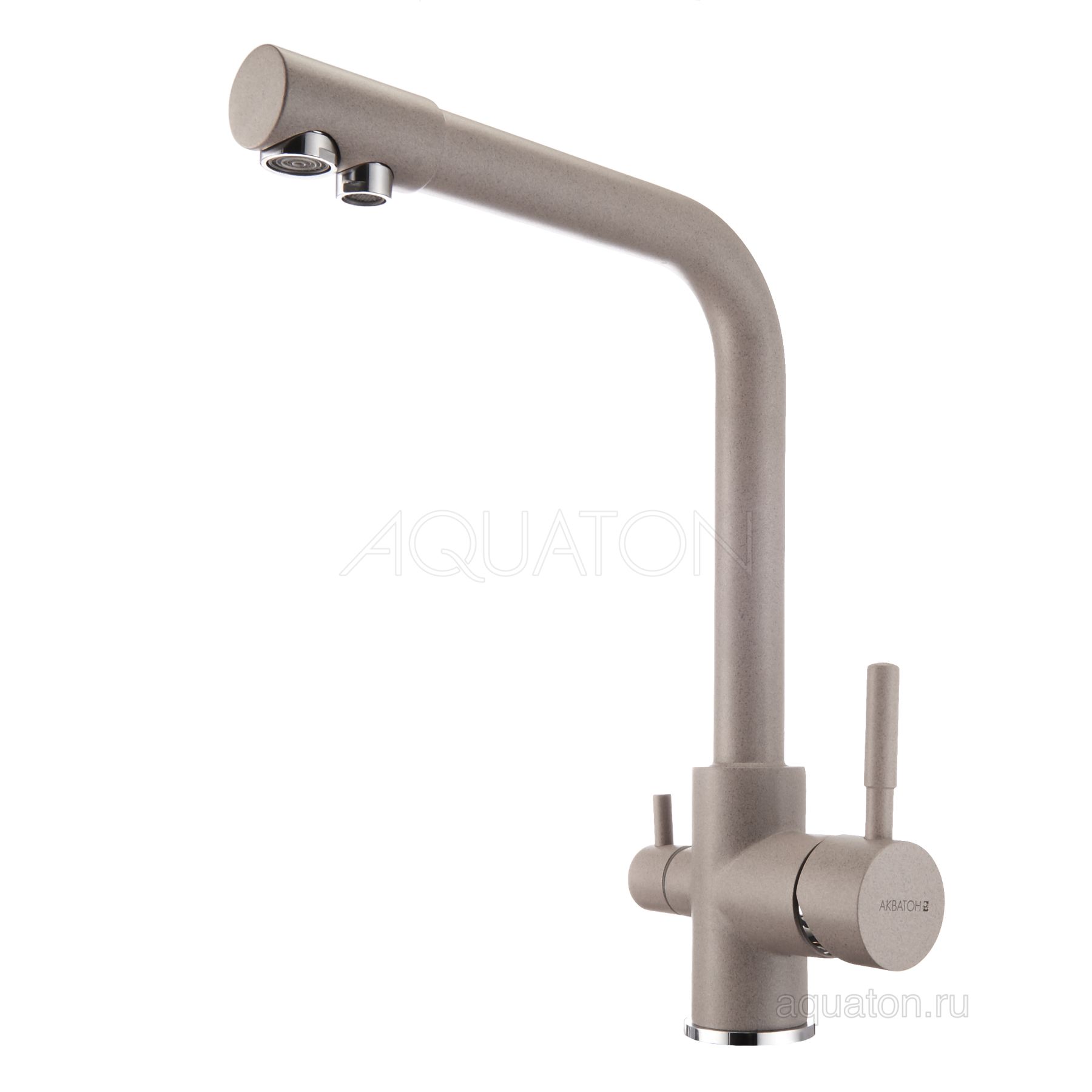 Смеситель Руан для кухонной мойки от компании Акватон. Подключение к фильтру пиьевой воды. Совмещенный излив. Цвет смесителя специально подобран в соответствии с цветом кухонных моек Акватон из литьевого камня. Корпус смесителя выполнен из латуни, что гарантирует долгий срок эксплуатации изделия, сопротивление коррозии и безопасность для человека. Декоративное цветное покрытие отличается высокой силой сцепления с поверхностью смесителя, обеспечивая устойчивость к царапинам и сколам.