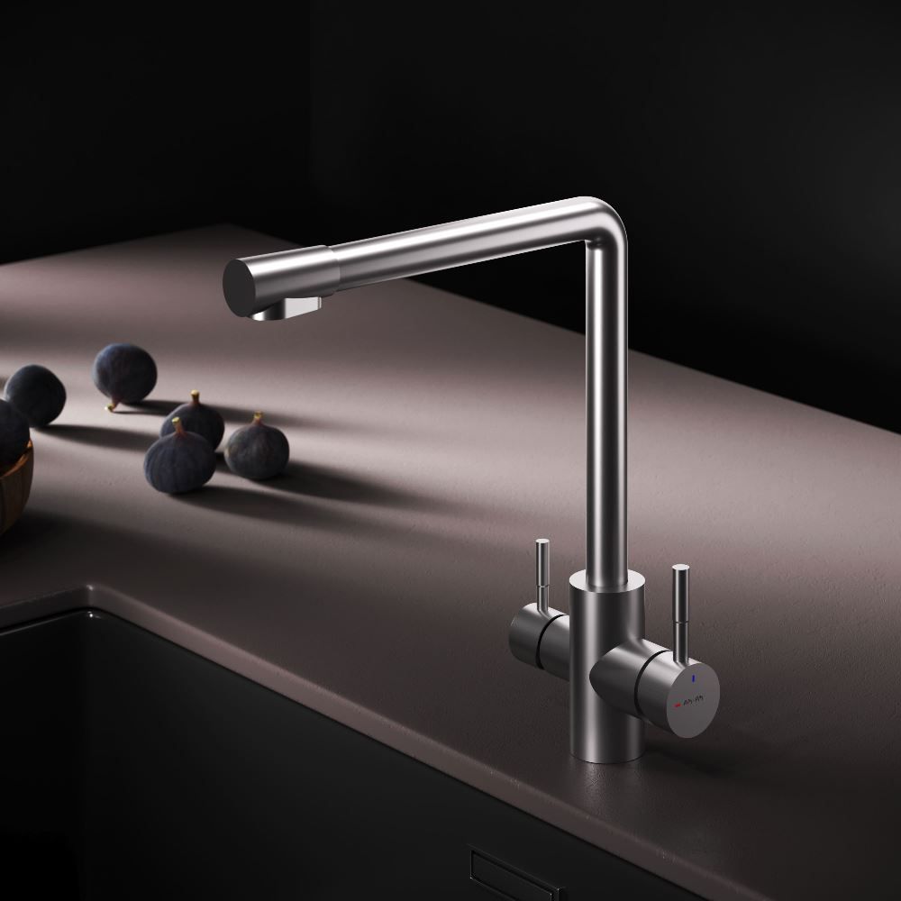 Смеситель оснащен встроенным каналом для питьевой воды. Для получения питьевой воды воспользуйтесь ручкой, расположенной с левой стороны корпуса, для получения обычной воды, просто управляйте смесителем привычным способом.