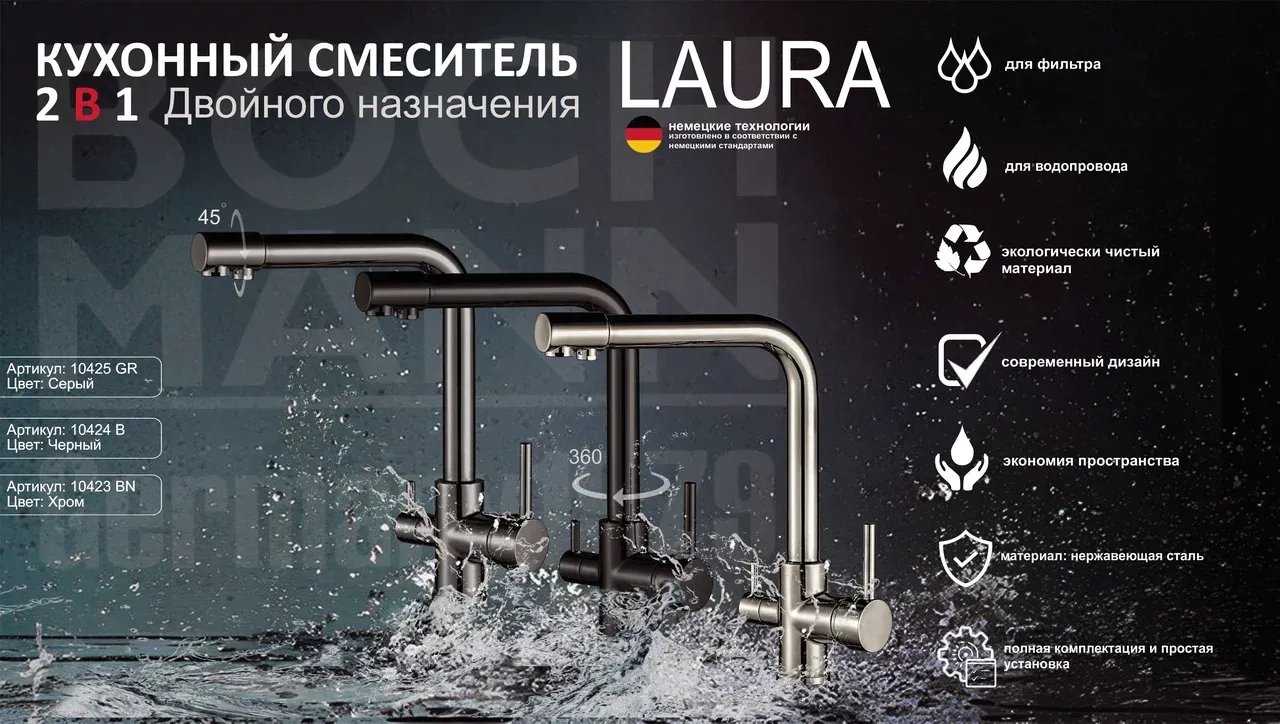 Cмеситель LAURA B из нержавеющей стали для кухни BOCH MANN BM10424 с краном под фильтр черного цвета - уникальная модель, которая подходит для кухонных моек, раковин , умывальников. Материал корпуса - нержавеющая сталь. Смеситель имеет керамический картридж 35 мм.