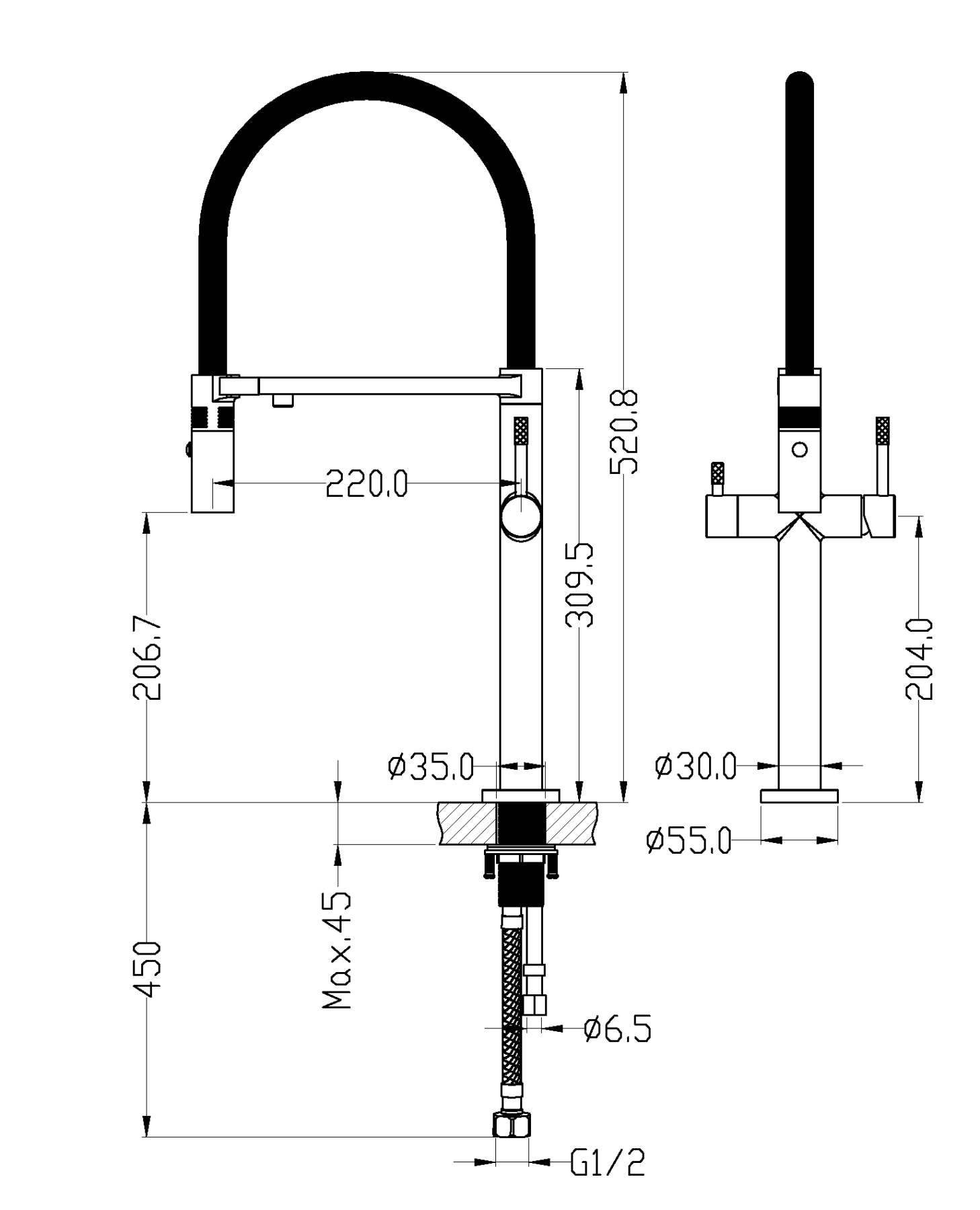 • Высота смесителя: