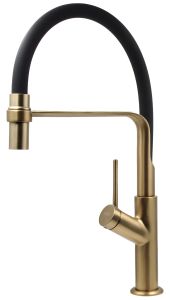 Смеситель Kitchen K50GB: Роскошный смеситель в черно-золотом исполнении с гибким изливом 22 см. Сочетание черного и золотого создает премиальный вид. Гибкий излив обеспечивает комфорт использования. Идеальный выбор для тех, кто ценит стиль и функциональность на кухне.
